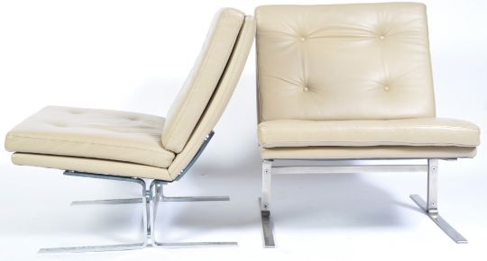 A pair of 20th century retro vintage easy / lounge chairs comprising of a chrome plated steel frame with supporting a cushioned button backed backrest and seat upholstered in a semi aniline white leather raised on a double splayed foot. The chairs bearing similarities to both Poul Kjaerholm and Ludwig Mies Van Der Rohe Measures; 75cm x 65cm x 75cm.
