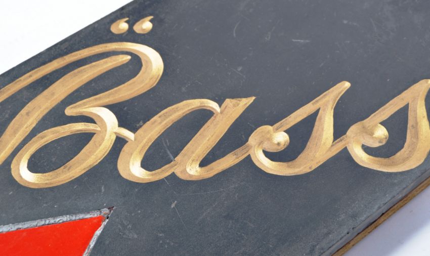 "Bass" - An original 20th century retro vintage breweriana slate point of sale pub display sign comprising of a slate slab being chiselled to read ' "Bass" On Draught ' having the red triangle tile reading ' Trade Mark ' to centre, all backed onto a thick plywood board.  Measures; 76cm x 25cm.