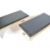 Zoeftig - Zenky - A pair of late 20th century retro vintage ply wood and steel airport terminal seating benches. The benches having a heavy metal base comprising of a cylindrical stretcher raised off two large triangular shaped supports with a further two smaller triangle shapes which support the plywood top with cushioned black faux leather seat. Applied makers mark to cylindrical stretcher.