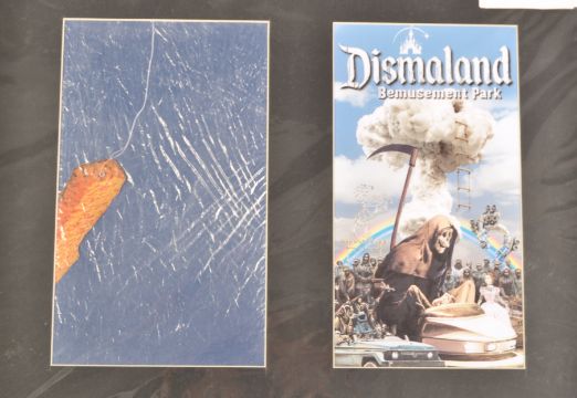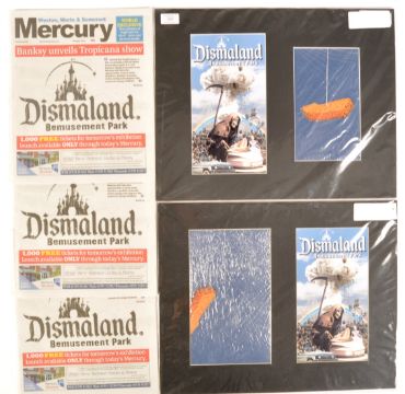 Banksy - Dismaland Bemusement Park 2015 - Two nicely framed cardboard fish fingers on a string used at the hook a duck (muck duck) stand with a enlarged print of the flyer along with three Mercury Newspapers announcing the unveiling of Dismaland.