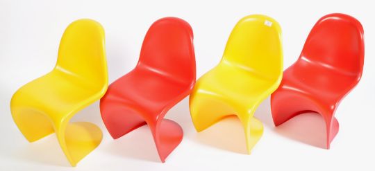 After Verner Panton - S Chairs - A set of four contemporary multicoloured plastic injection molded kids chairs. The chairs being in red and yellow colourways. Measures 56cm x 32cm.
