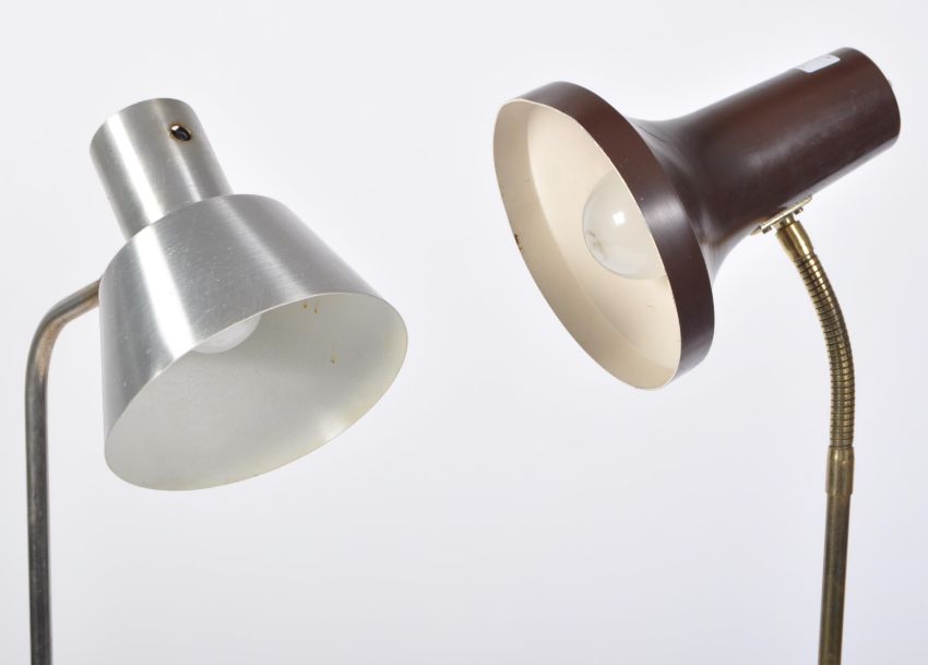 Two 20th century retro vintage floor standing / standard lamps each having gooseneck arm supporting two stepped shade and raised on round weighted bases, one being in a brown and gold colourway and the other in brushed aluminium with markings 'TYP 299'.