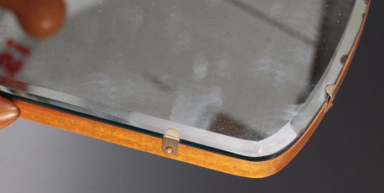 A stunning mid 20th century retro vintage teak wood table top vanity mirror comprising of a shaped flat plinth with two domed sections to either side of which come tapering legs that come to a point and attach to a shaped teak section with screw fitting that supports the beveled shaped mirror. Measures; 51cm x 51cm x 20cm.
