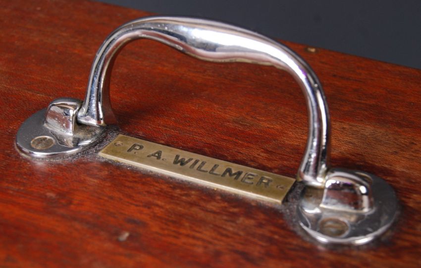 An antique early 20th century mahogany counter top dental / dentist apothecary cabinet having an arrangement of six graduating milk glass bottom lined drawers each with stainless steel knob handles, the top of the cabinet having a hinged and lockable lid revealing a felt lined compartment and the lid having a handle atop with plaque for P.A Willmer. Measures; 40cm x 33cm x 23cm.