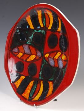 Angela Wyburgh - Poole - Delphis - A 20th century retro vintage studio pottery serving plate / platter with handles either side in vivid volcano coloured glazes. The plate stamped Pooleto base and being signed.