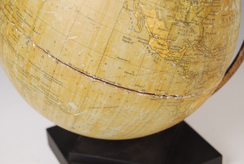 Philips' - John Heywood Ltd - A mid 20th century retro vintage 8 inch terrestrial desk globe retailed by John Heywood, Manchester and London. The globe being supported by a metal semi circumference band and as raised on a moulded square base with stepped rhombus.