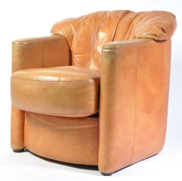 A 20th century retro style bucket / lounge chair / armchair having a deep cushioned pad seat, shaped back cushion with a backrest forming the arms. The chair being upholstered in a tan semi-aniline leather. Measures 80cm x 80cm x 45cm.