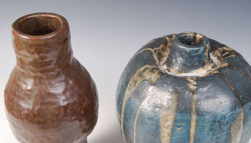 Two retro vintage studio art pottery gourd type vases to include; a tall cylindrical and bulbous formed vase with a brown gloss glaze and the other being of tapering bulbous form with an ocean blue and white drip glaze. Both unmarked. Measures; 33cm tall.