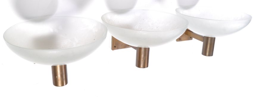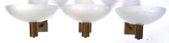 Believed Paul Boissevain - The Merchant Adventurers Ltd - Architectural Salvage - A set of three 1950's wall uplighters consisting of a  bronzed wall bracket leading into a cylindrical section of which the large frosted glass shade is sat upon and a screw fitting ring to secure it in place. The lights removed from The Freemasons Hall, Park Street, Bristol. Originally being installed during the 1950's rebuild after the severe damage from the Blitz, the lights were commissioned especially for the refurbish.