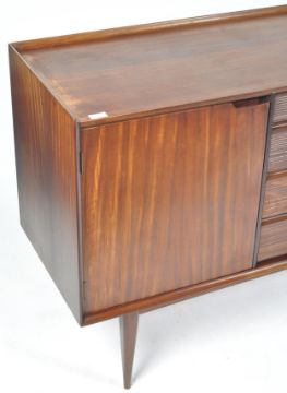 A 20th century original retro vintage Richard Hornby for Heals teak wood afromosia sideboard / credenza. Gallery back with four graduation drawers to front, ribbed design, flanked by cupboards. Shelved interior, standing on tapering legs.