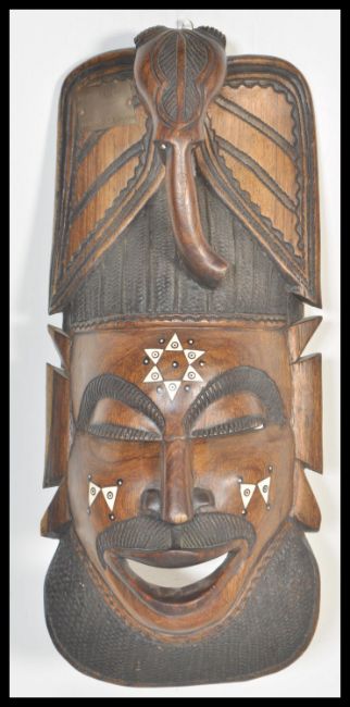 Two 20th Century African carved wooden artifacts to include a large ebony warrior fertility statue figurine and a large wall face mask plaque having inlay decoration.
