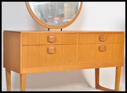 A retro 20th Century Danish inspired teak wood dressing table chest, central circular mirror over a configuration of drawers and cupboards. Measurers 137 cm high x 114 cm wide x 43 cm deep.