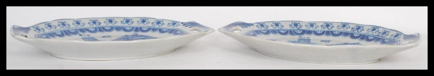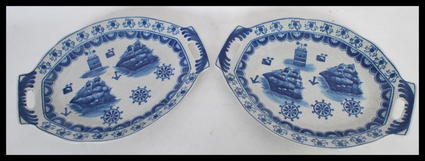 A pair of blue and white twin handled trays, the trays decorated with a nautical theme depicting ships at full mast. Measures 35 cm wide.