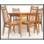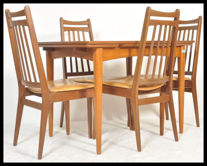 A vintage retro 20th Century teak Danish influence dining table suite with a set of four vintage teak wood chairs. The extending dining table with leaves raised on shaped supports. The set of four rail dining chairs having tan vinyl seats. Measures 73 cm high x 157 cm wide x 75 cm deep.