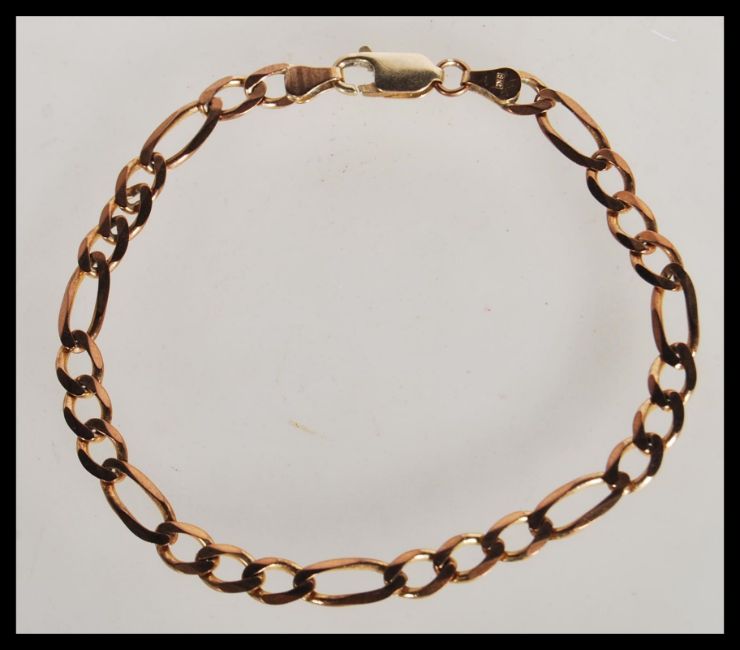 A 9ct gold belcher link bracelet with lobster clasp being stamped 9k. Length 22cms / weight 7.7g. Measures 20cm long.