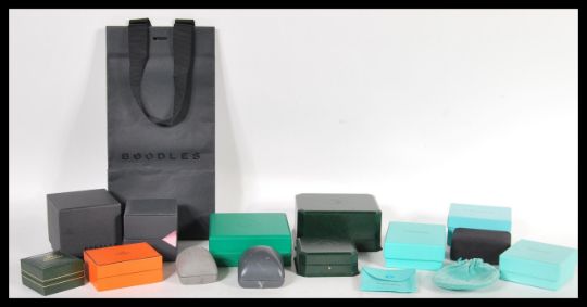A collection of designer jewellery boxes to include Boodle & Dunthorne, Hermes, Tiffany & Co, Boodles, and David Morris. 10 in total.