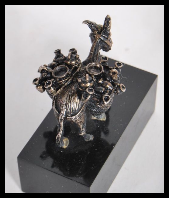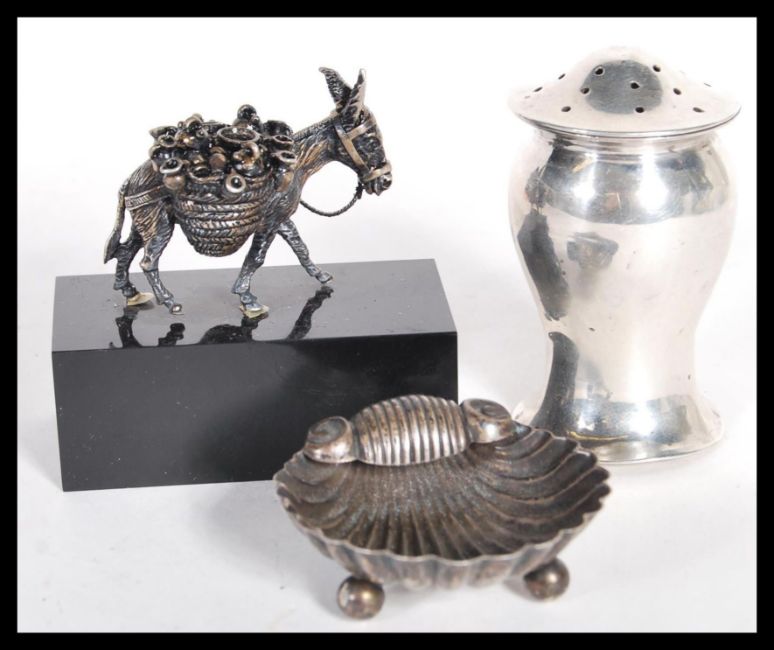 A hallmarked silver small trinket dish in the form of of a shell along with a hallmarked pepperette and a white metal figurine of a donkey raised on black block base. Tallest measures 6cm high.