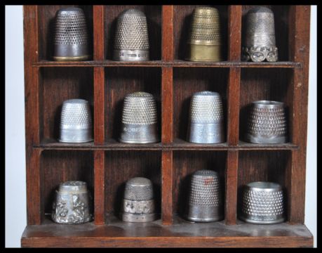 A collection of silver, hallmarked silver and silver plated thimbles all contained within a miniature wooden dresser. Measures 21cm high by 13cm wide.