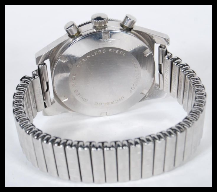 A vintage Rotary Aqua Plunge gentleman's wrist watch having a round face with a black dial, with baton markings to the chapter ring and two subsidiary dials, within a steel case, and having an expandable bracelet. Face measures 32 mm diameter.