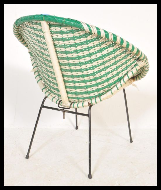 A vintage retro 20th Century wicker satellite chair raised on tubular legs and frame with green and white wicker seat. Measures 70cm high x 66cm width x 45cm deep.