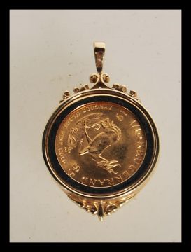 A 9ct gold necklace pendant inset with a 1/10 South African gold Krugerrand coin dated 1985. Total weight 5.5g. Measures 2cm diameter.