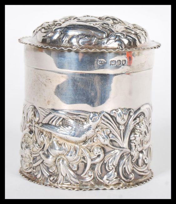 A 19th Century Victorian Art Nouveau hallmarked silver lidded pot by William Comyns & Sons having embossed relief decoration depicting birds scrolls and flowers. Weighs 105 grams. Hallmarked for London 1897. Measures 7 cm high x 8 cm diameter.
