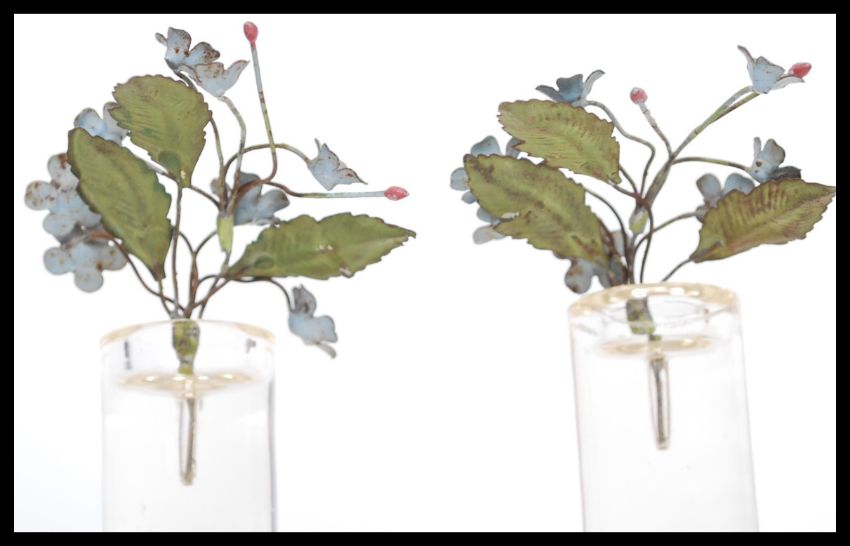 A pair of early 20th Century French hand worked enamel on metal floral flower sprays in glass column stands in the manner of Faberge. Blue enamel flower heads on worked metal stems and leaves over glass column bases. Measures 11 cm high.