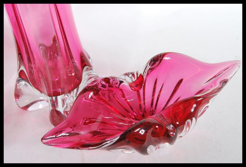 A set of four 20th Century Murano Sommerso studio art glass pieces in cranberry colourways comprising of two bowls and two vases of similar form. Tallest measures 31cm high.