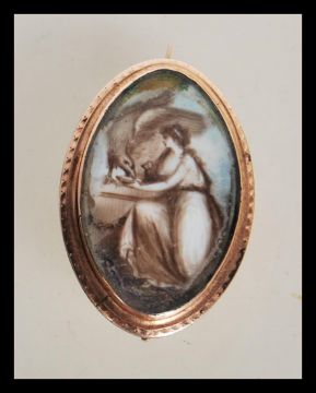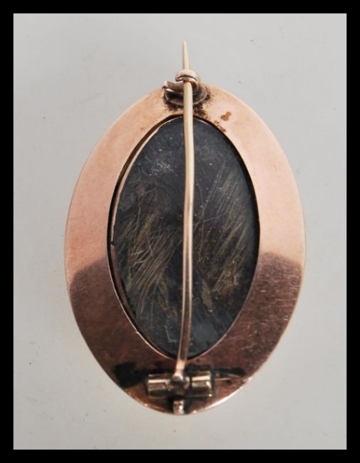 An 18th Century Georgian mourning brooch of oval form having a central panel with a hand painted scene of a Greek mythological tale of Hebe feeding the eagle of Zeus, set within an unmarked rose metal setting, with an exposed panel of hair behind and pedant bale present to the back. Weight 8.5g. Measures 4cm long.
