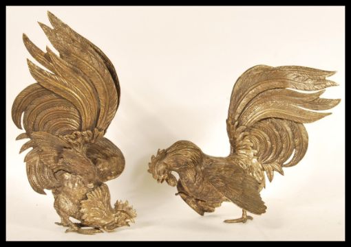 A pair of early 20th Century silver plated figurines depicting fighting cocks or cockerels. Both modelled in differing aggressive stances. Tallest measures 26cm high.