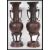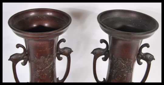 A pair of 19th century Japanese bronze vases of baluster form having twin scrolled handles with relief decoration and flared rim. Measures 45cms high.