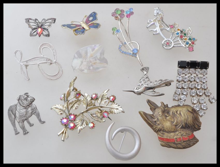A collection of vintage brooches to include a brass scottie dog brooch, an enamelled butterfly brooch, a floral brooch set with coloured stones, a silver filigree letter brooch, a silver brooch in the form of a bulldog, a horse and carriage brooch etc.