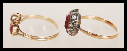 A stamped 9ct gold ring set with four round cut garnet stones (size P.5) along with a stamped 9ct gold and silver ring set with a rectangular red stone set in a silver Art Deco setting with white accent stones (size N.5). Weight 4.3g.
