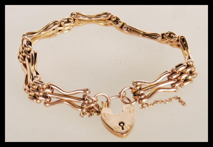 A 20th Century stamped 9ct gold heart lock bracelet with a decorative link design. Total weight 13.0g. Measures 21 cm long.
