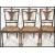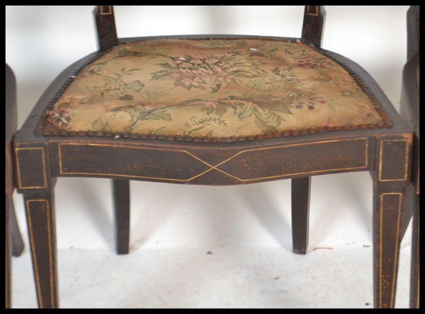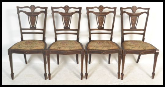 A set of four Edwardian marquetry seaweed inlaid mahogany dining chairs being raised on square tapering legs with spade feet having pad seats. Above, vase shaped back rests with scrolled top rails, the central vase panel with sea weed inlaid detailing. Measures 87cm high x 46cm wide x 42cm deep.