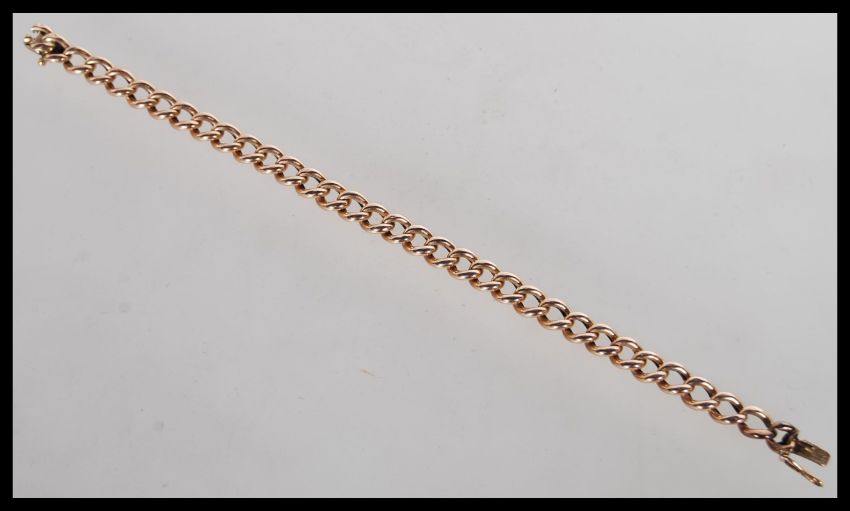 A 9ct gold curb link bracelet with a open box clasp. Bracelet unmarked but tests as 9ct. Weight 11.3g. Measures 21 cm long.
