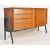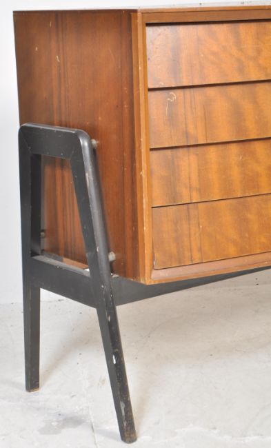 A vintage mid 20th Century bow fronted teak wood - tola wood sideboard / credenza, a bank of three drawers flanked to the right by a tambour door opening to reveal shelved cocktail cabinet raised on suspension  ebonised angular frames.