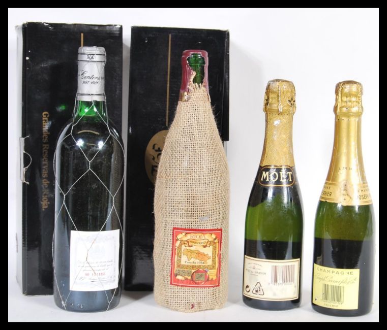 A group of wine and champagne to include two boxed Rioja Siglo wines, Moet and Chandon half bottle of champagne and a Joseph Perrier half bottle of champagne. Tallest measures 29cm high.