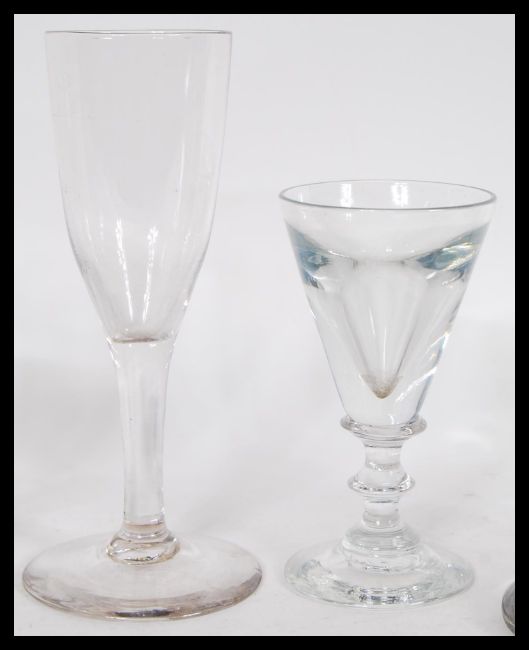 A group of six 18th / 19th Century Georgian glasses to include a pair raised on circular foot with bladed knop and tapered bowl, large rummer example raised on large folded base with bell bowl, etc. Measures 18cm high.