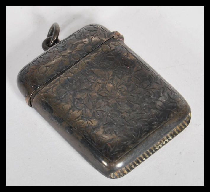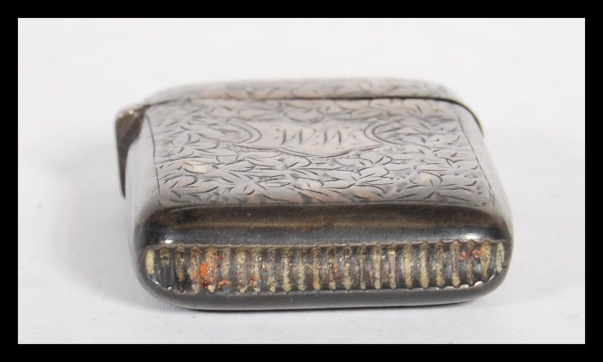 An early 20th Century hallmarked silver Edwardian vesta march case having engraved Armorial decoration. Hallmarked for Chester 1903. Weighs 27.3 grams. Measures 5cm high x 11cm width.