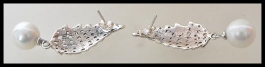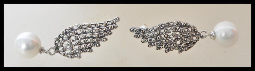 A pair of stamped 925 silver earrings in the form of wings, set with marcasites having pearl drops below. Weight 12.4g. Measures approx 5cm.