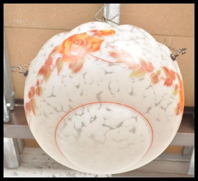 A vintage early 20th Century  mottled glass 1930's Art Deco ceiling light shade, the shade the with scalloped rim decorated with swags of orange roses. The shade retaining hanging chains.