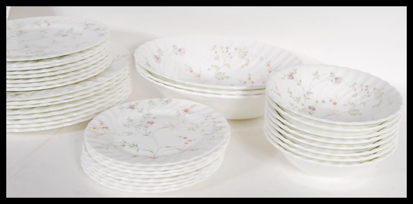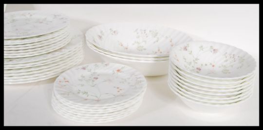An extensive Wedgwood Bone China Campion pattern dinner service, most pieces unused within the original plastic. Various graduating platters and plates. Measures 36cm width x 28cm deep (meat plate)