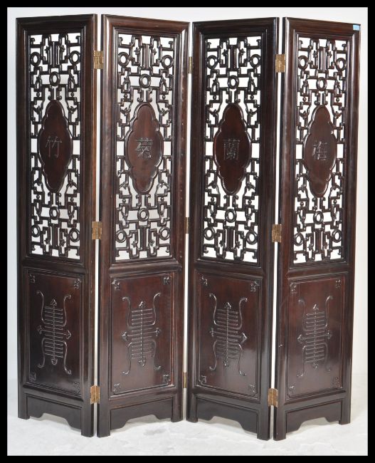 A large 20th Century Chinese padauk wood four panel folding discretionary screen room divider having lacquer finish. Carved frer pierced decoration with central panels depicting birds and flora. Raised over medallion set panels.