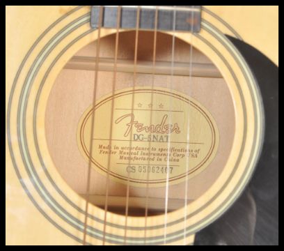 A 20th Century Fender six string acoustic guitar model DG-5 NAT having a shaped hollow body with chrome tuning pegs. Paper label to interior with serial number CS 05062407, cased.