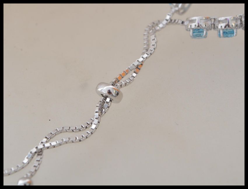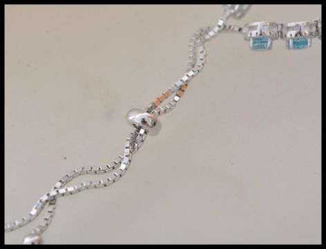 A stamped 925 silver bracelet having round panels set with cz's and blue topaz stones. Weight 10.3g. Measures approx 12 inches in total with an adjustable clasp.