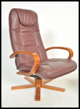 A contemporary leather swivel  chair with matching footstool, the chair and footstool upholstered in soft leather and raised on shaped supports. Measures 107 cm high x 62 cm wide x 76 cm deep.