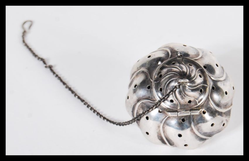 A 19th Century Chinese silver tea strainer of gadrooned form set in silver hook chain. Weighs 17.1 grams. Measures 5 cm diameter.