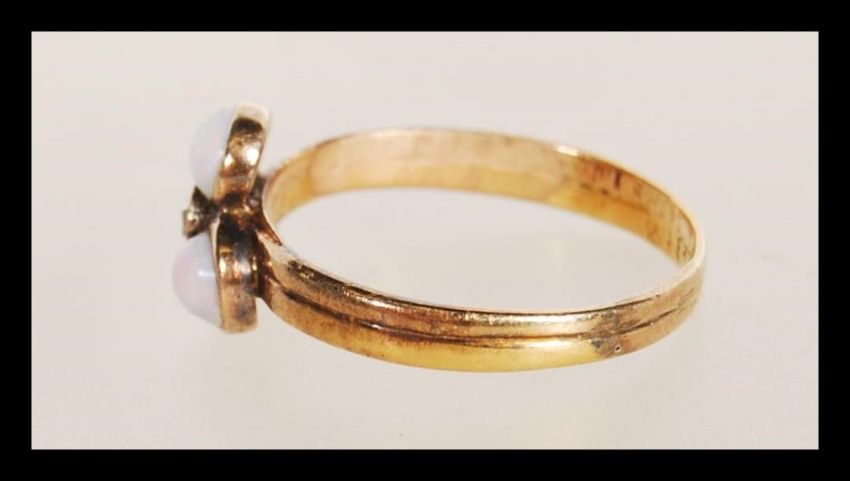 A 20th Century 9ct gold ring set with three opal cabochons. Marks rubbed but tests as 9ct. Weight 1.9g. Size K.