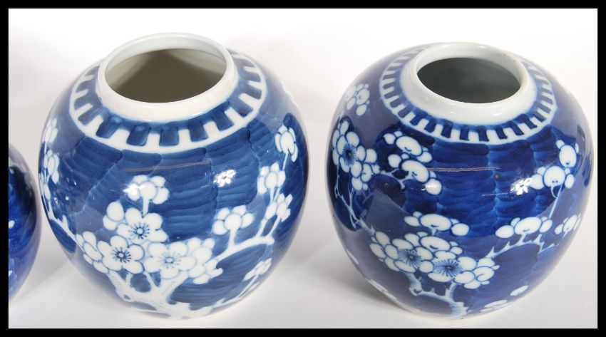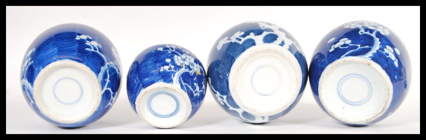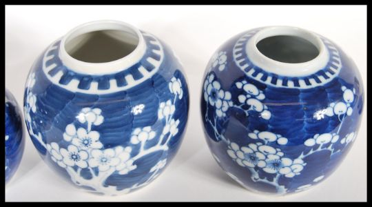 A Group of four Chinese 19th Century hand painted blue and white ginger jars in the prunus pattern. Comprises of three of similar size and a smaller example. Highest measures 16 cm high x 12 cm diameter.
